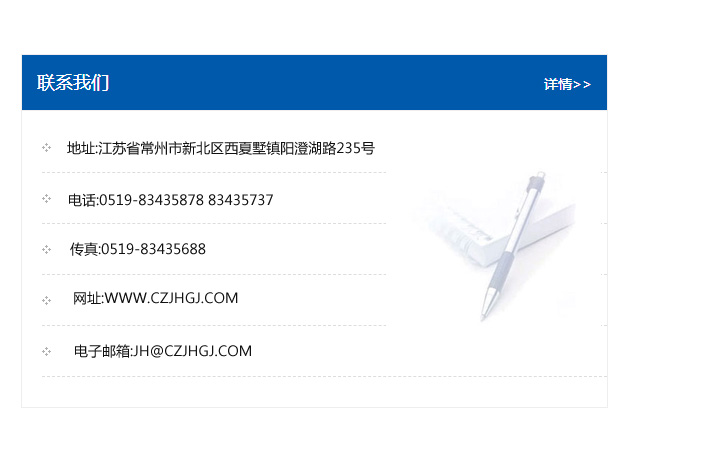 地址:常州市新北區友邦商務大廈1幢16、17層  電話:0519-85101652  傳真:0519-85112595  郵編:213022  網址:www.cz-jiayue_cn.tjtsfnt.com  郵箱:xiajifengaa@163.com